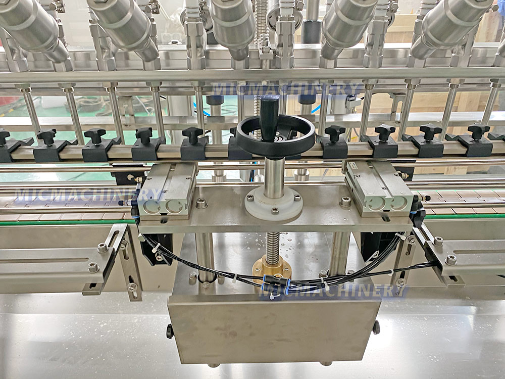 The adjustable conveyor in a gravity filling machine ensures precise alignment and smooth transport of containers during the filling process. It allows for easy adjustment of speed and positioning, accommodating various container sizes, improving efficiency, and ensuring accurate, consistent filling for different products.